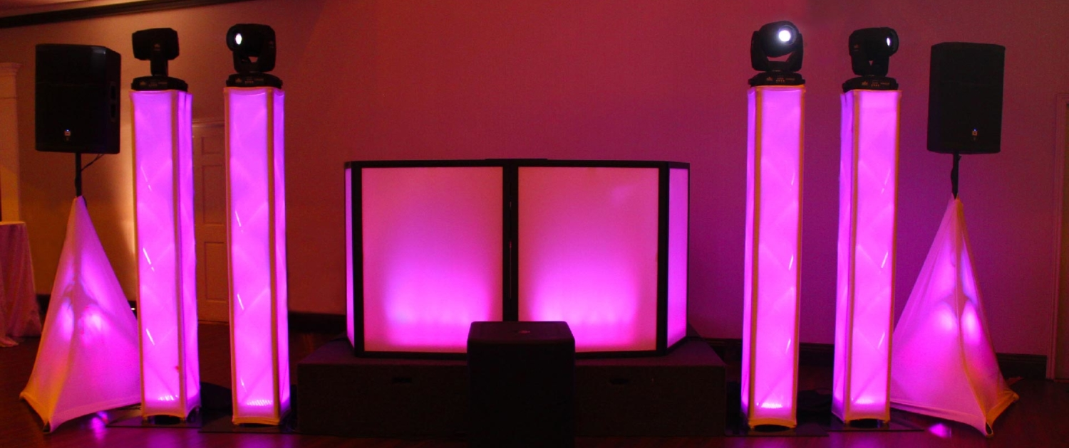 Four moving heads Four truss towers Twenty uplights Six stand covers with lights